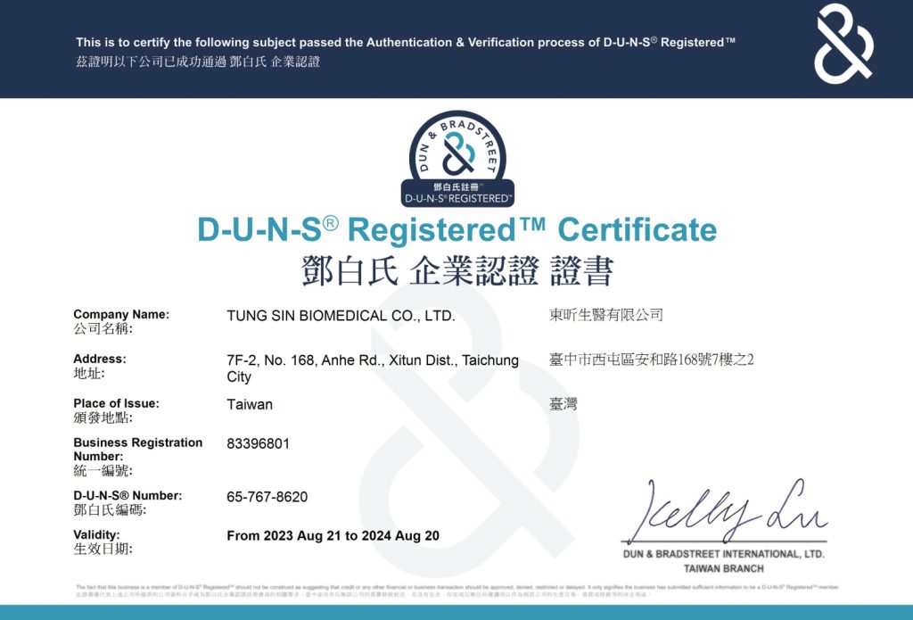 東昕生醫榮獲「鄧白氏第三方企業認證」鄧白氏環球編碼® ( D-U-N-S Number® )為65-767-8620,並授權安裝經權威認證的鄧白氏企業認證™(D-U-N-S® Registered™)電子標章。鄧白氏企業認證 用專屬身分證提升國際能見度。提供台灣企業國際通用的專屬編號,是國際貿易不可或缺的必備資訊,若要出口全球,或是與跨國廠商進行貿易,都需要鄧白氏企業認證,以加速信任的建立和成交的效率。全球國際大廠及政府單位,都將鄧白氏企業認證列為商業往來必備資訊;包括美國《財富》雜誌全球最大500企業榜單中超過90%公司、美國食品暨藥物管理局、欲將App在iOS商店上架的公司,在申請Apple企業開發者帳號,或是其他業務往來時,都需要鄧白氏企業認證資訊。